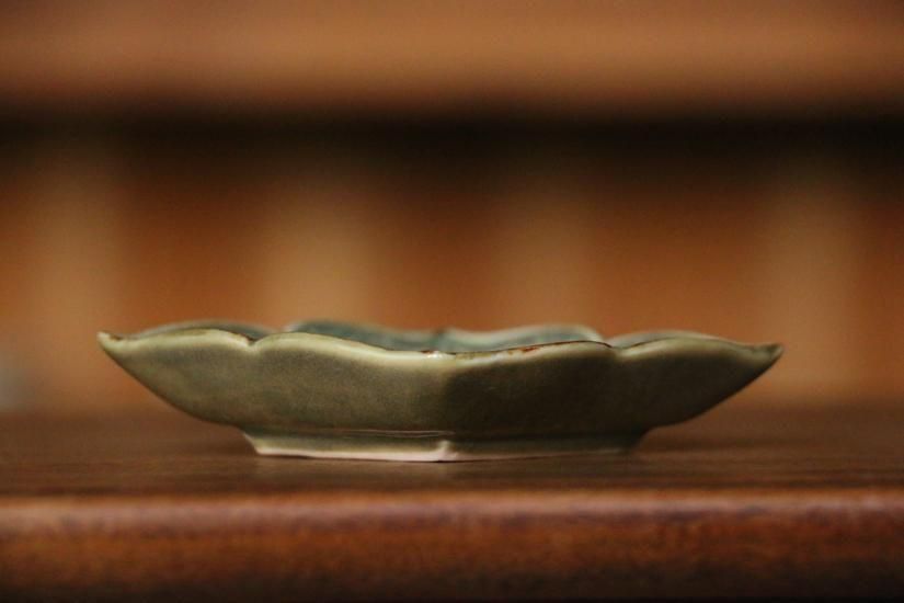 東洋を感じる文様や縁の鉄巻の茶色、またうぐいす釉で文様がくっきりと見えてかわいらしくなってます。