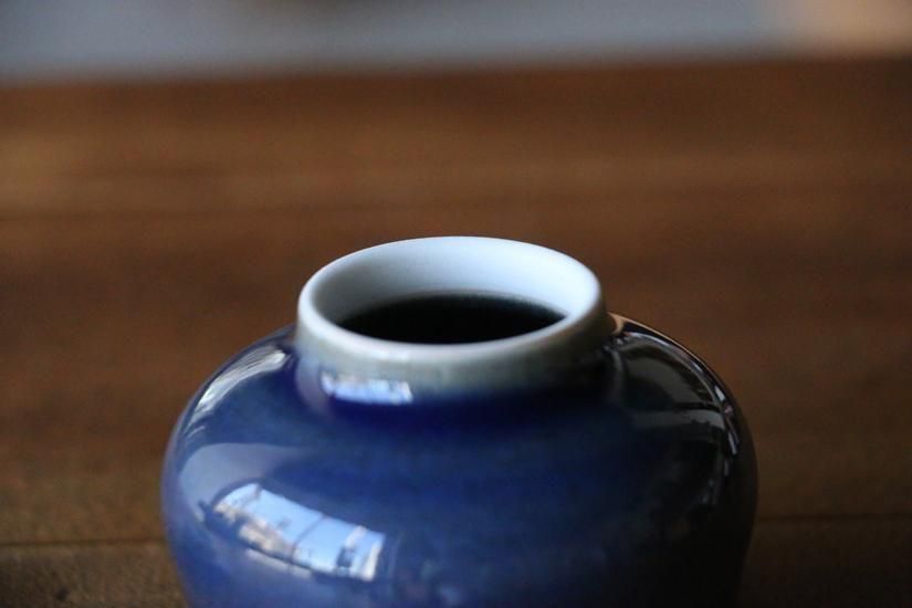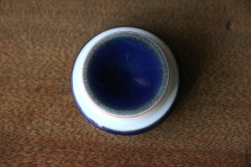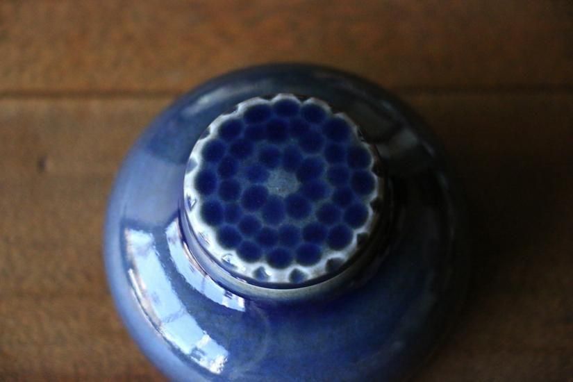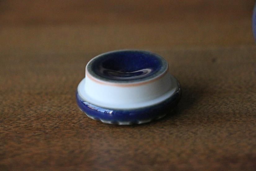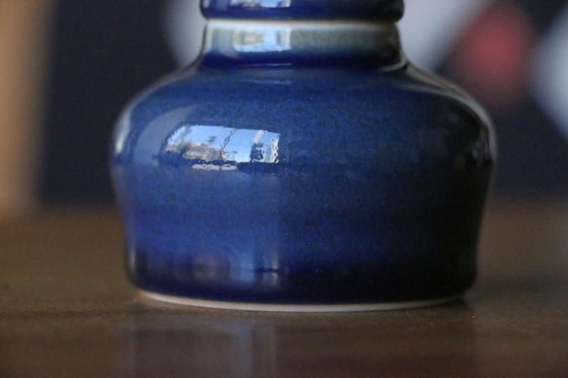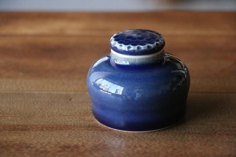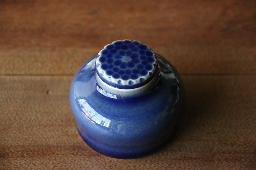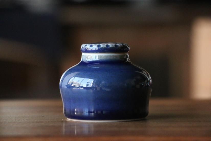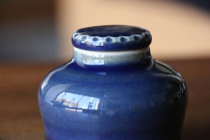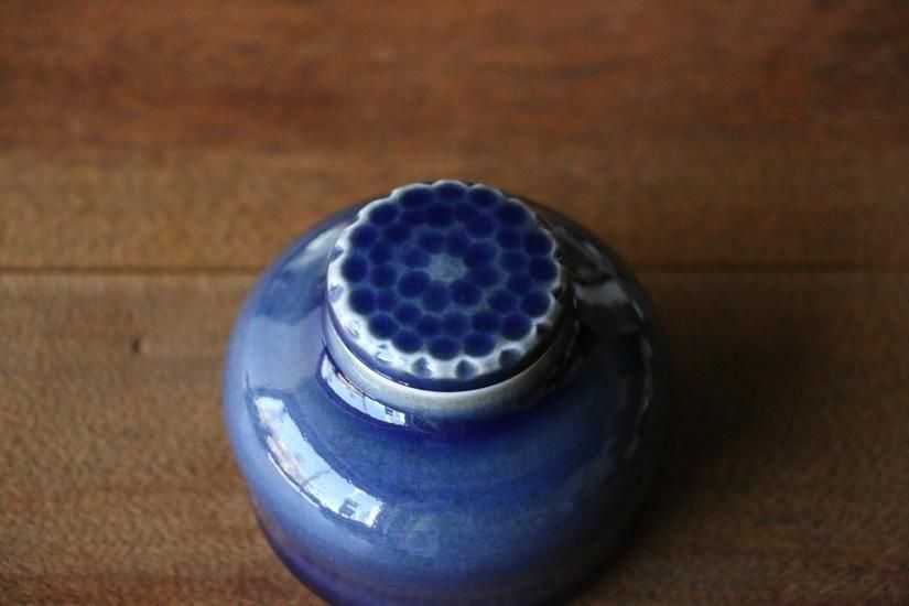 濃い瑠璃釉が美しく、蓋に飾られた文様や有機滝な形が、とてもかわいらしいです。